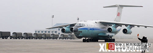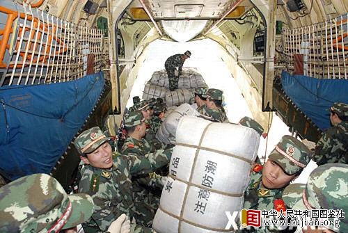 从1月30日起,武警陕西总队官兵在西安咸阳国际机场为4架次空军运输机紧急装运5.9万件棉衣运往贵州灾区。 新华社发(马羽 摄)