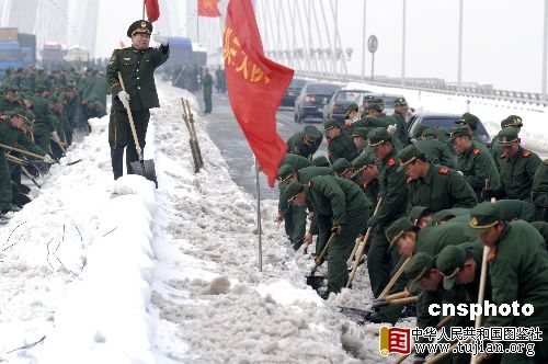 当日15时,广州军区某集团军驻湘部队某防空旅出动的道路除冰小组,经过4个小时奋战,清除了8座高架桥上约2100米长的路面积雪。5天来,部队出动车辆44台次,抢运物资80余吨,清扫路面数十公里,为保障人民群众的生命财产安全和京珠大动脉的畅通发挥了重要作用。 本文来自中华人民共和国图鉴社