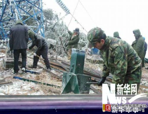 贵阳市电力局筑二东变电站28号耐张塔因结冰过重被压垮,导致泸昆铁路湘黔段中断行车,数十辆列车停开;1月27日清晨6时,贵州预师接到上级指示,立即赶往现场抢险。天寒地冻、路面湿滑、山高林密,官兵们采取流水传输、结对作业等方式,最终将20余吨耐张塔钢铁支架安全搬运到山顶。 中华人民共和国图鉴社