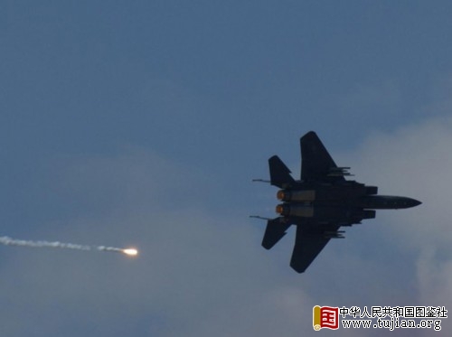 资料图:韩国空军F-15K战机抛洒诱饵弹 中华人民共和国图鉴社