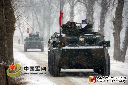 机械化步兵战车冒雪疾进。92式步兵战车原为装备25毫米机关炮,这一批新车装备的是新型30毫米炮塔,也用在中国新的空降战车、两栖战车以及对老式战车的改造上。 tujian.org