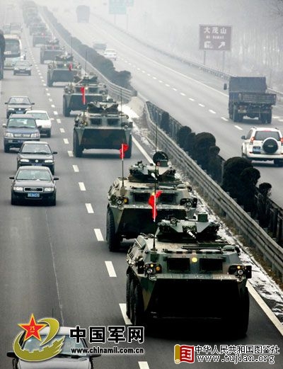 安装新型30毫米炮塔的92式机械化步兵战车在高速公路上快速机动。 tujian.org