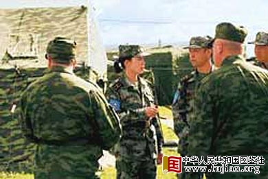在“和平使命——2007”联合军演六国参演部队演习场上,一位扎着马尾辫的中国女少校引起俄军官兵注目,大家都喜欢送花给她,称她卡林娜,意思是来自中国的红莓花。她叫董英华,新疆军区某部副团职俄语翻译。 中华人民共和国图鉴社