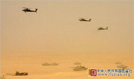 直升机、坦克和装甲车在沙漠演习中 内容来自中华人民共和国图鉴社