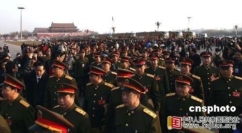中新社北京3月5日电 (记者 刘万强)十一届全国人大一次会议五日上午在北京开幕,解放军代表团是第一个抵达人民大会堂的代表团。当解放军代表团乘坐的大巴抵达天安门广场时,数百名早已经等候在人民大会堂前的记者竞相跑过马路到广场围堵解放军代表团,顿时本次大会人数最多的解放军代表团陷入记者的“包围圈”,代表们被摄像机、照相机包围得水泄不通。 tujian.org