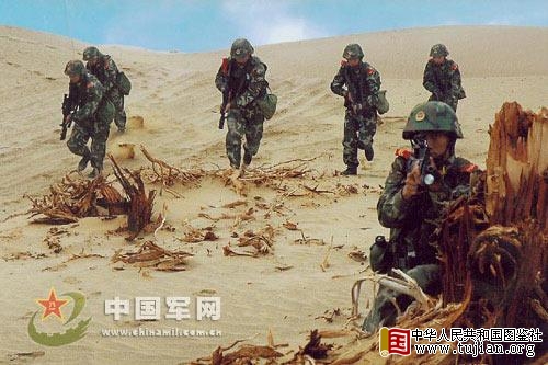 资料图:新疆武警官兵在大漠深处进行沙漠围捕恐怖分子演练 copyright 中华人民共和国图鉴社
