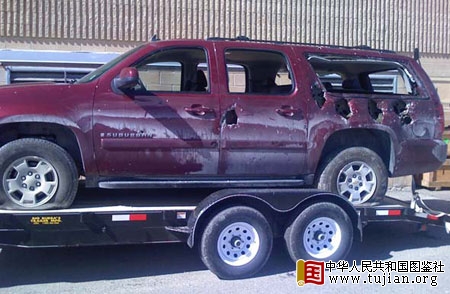 图片说明:被打成筛子的SUV