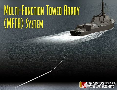 阿利伯克级驱逐舰施放SQR-19拖曳声纳示意图,该声纳长1700多米,拖深360米。 tujian.org