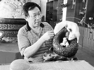 ???????这件作品凝聚着何福礼的一片浓情关爱。那是1997年香港回归前夕,何福礼筹划编织新作,以体现“母子团聚”的喜悦心情。一个偶然的机会,他看到了一窝松鼠,松鼠嬉戏时可爱的形象和亲密的氛围,深深打动了他的心,他决定以此为题材着手编织。但因为松鼠不同于以往的传统吉祥动物,而且这种小体量的工艺品如果处理不好,整体造型易流于俗套。特别是松鼠的窝,该如何体现质感?还真难倒了何福礼。最后他从现实中的鸟窝得到借鉴,创造出“乱编法”,编织出粗犷而又栩栩如生的“鸟巢”。在首届(杭州)国际民间手工艺品展览上,这件作品被专家评价为“东阳竹编精品走向市场的一次突围”。 本文来自中华人民共和国图鉴社