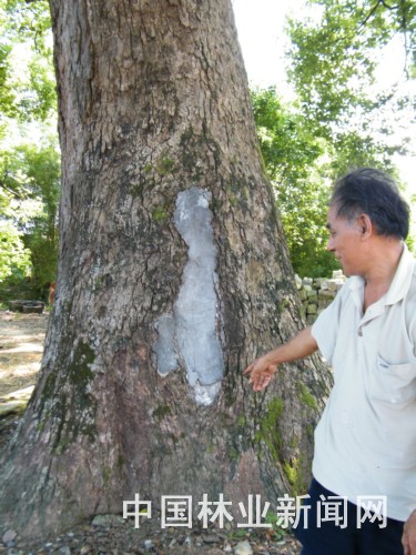 ???????广西壮族自治区恭城瑶族自治县栗木镇关公庙前,一株有着350年树龄的樟树树干上,竟有一条长80厘米、宽30厘米的水泥疤块。