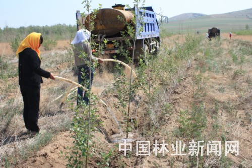 ???????今年4月以来,敖汉旗北部沙地持续干旱少雨。新惠林场紧急筹措资金30余万元用于抗旱。从7月23日开始,全场每天出动运水车辆10台,计划用10天时间完成5000亩幼树浇水作业。