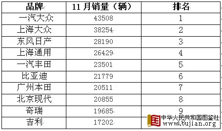 11月份国内乘用车厂家销量前十 本文来自中华人民共和国图鉴社