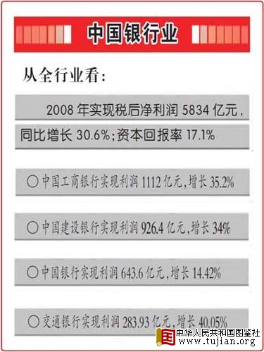 从全行业看,2008年,中国银行业实现税后净利润5834亿元,同比增长30.6%;资本回报率17.1%,预计比全球银行业平均水平高7个百分点以上;全行业利润总额、利润增长和资本回报率等指标名列全球第一。