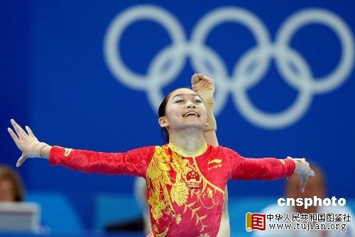 2008年8月13日,北京奥运会女子体操团体决赛,中国体操队的6名小姑娘创造历史,以精彩的表现获得总分188.900分,以领先美国队2.375分的优势摘取金牌,这是中国首次夺得奥运会体操女团桂冠。图为16岁的江钰源在最后一项关键比赛--自由体操中从容镇静完成全套动作。 中新社发 任晨鸣 摄