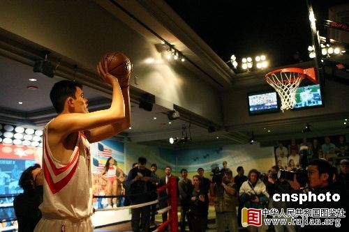 NBA中国球员姚明的蜡像18日首次在纽约杜莎夫人蜡像馆与公众见面,引来众多媒体关注。 中新社发 李静 摄