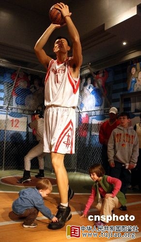 NBA中国球员姚明的蜡像18日首次亮相纽约杜莎夫人蜡像馆。来自堪萨斯州凯尔(左)和卡米拉对姚明的“大脚”十分好奇。 中新社发 李静 摄
