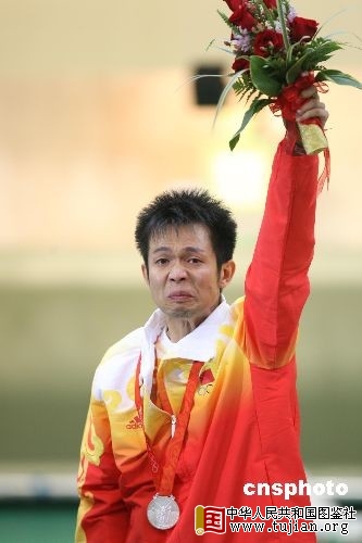 资料图:2008年8月11日,中国选手朱启南在北京奥运会男子10米气步枪决赛中以699.7环的成绩夺得银牌。图为朱启南在领奖台上落泪。 中新社发 武仲林 摄