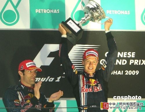 2009年F1中国大奖赛4月19日下午在上海国际赛车场结束,红牛车队维泰尔(右)夺得冠军。 中新社发 赵振清 摄 版权声明:凡注有“cnsphoto”字样的图片版权均属中国新闻网,未经书面授权,不得转载使用。 【更多图片】 “某些路段,你就好像开着车冲向湖面一般。”正如巴顿所言,昨天的F1中国站在一片大雨中拉开大幕,但这并没有妨碍一个年轻人在赛道上震惊世界,从排位赛豪取杆位到正赛一枝独秀,这显然是一个属于红牛车队德国小将维泰尔的周末,而领奖台上跳起挥臂庆祝胜利的一幕无法不让人想起他的德国同胞迈克尔·舒马赫,“无论从哪个角度来说,他都很像我的接班人。”40岁的舒马赫坐在电视前享受生活的同时,21岁的维泰尔已经重新开始一个属于德国人的冠军故事。