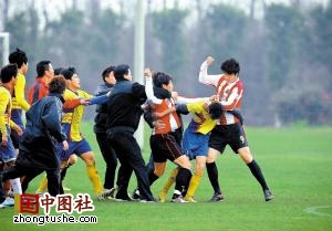 22日下午,成都谢菲联队和四川都江堰队在谢菲联基地进行一场热身赛,前者在为下周揭幕的2011中超准备,后者则在准备5月份的中乙联赛。不过,这场旨在切磋的同城之战却演变为全武行,双方[ShuangFang]球员[QiuYuan]极不冷静地发生斗殴。