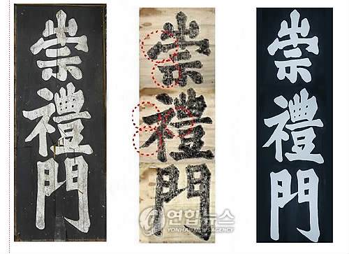 报道中称,国立文化遗产研究所在复原牌匾的过程中,比较分析在良平大君寺庙旨德寺存放的崇礼门牌匾拓本资料、日本帝国主义占领时期拍摄的玻璃帧照片,以及复原前的牌匾上的字体后发现,旨德寺拓本是原先的字体。 copyright 中华人民共和国图鉴社