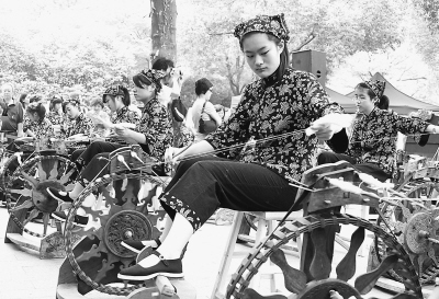 6月13日,国家级非物质文化遗产乌泥泾(黄道婆)手工棉纺技艺在上海徐家汇公园举行展演。图为中学生展演脚踏棉纺车纺纱技艺。劳 任摄