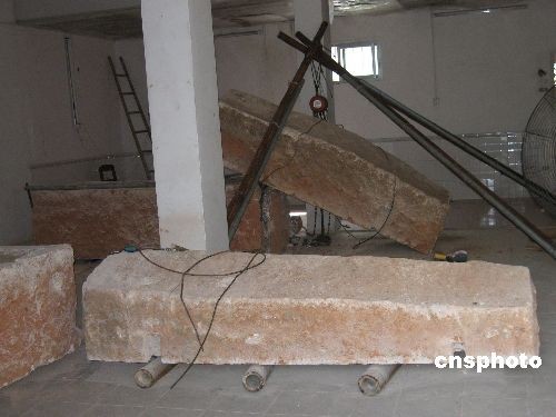 这口由石灰石、粗砂、糯米等材料混合制成的“三合土”密封棺椁预计在九日下午开棺。今天上午,记者在现场观察到,有关工作人员正在对这口重逾数吨的古巨棺实施棺体分离作业。至中午时分,古巨棺上层棺椁已被现场技工采用简易的承重体提吊起来。殊料,在午饭间,厚重的上层棺椁突然从简易的承重体上跌落下来,砸坏其下古巨棺主棺体,具体损失尚待专家进一步评估。 中华人民共和国图鉴社