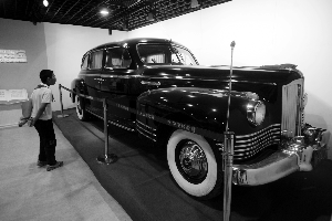 昨日,宋庆龄故居新建的文物库,一名学生在欣赏上世纪50年代斯大林赠送给宋庆龄的“吉斯”牌轿车。本报记者 薛珺 摄