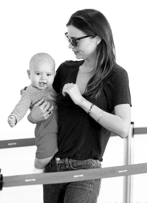 当天的Flynn在妈妈的怀抱中身穿条纹上衣红色长裤,虽然只有六个月大,但是这位小帅哥却不惧怕镜头,面对狗仔的跟拍,小宝贝开心地咧嘴狂乐,大大的眼睛,圆圆的脸蛋,萌点十足。而当天的米兰达·可儿则是身穿黑色低胸T恤,牛仔裤,尽显自己产后的完美身材。鱼儿