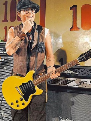 约翰尼•德普日前为摇滚乐团Alice Cooper跨刀,难得当众弹起电吉他(图来自台湾苹果日报)