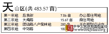 据了解,19宗土地中,天山区共4宗,合计32.24公顷(483.57亩);沙依巴克区共7宗,合计78.11公顷(1171.58亩);水磨沟区共4宗,合计27.47公顷(412亩);新市区4宗,合计95.22公顷(1428.36亩)。