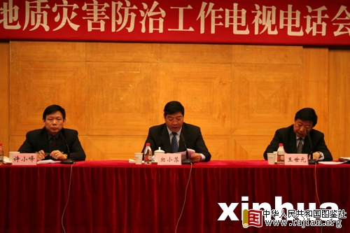 2006年4月19日,全国地质灾害防治工作电视电话会议在北京召开。左起:中国气象局副局长许小峰、国土资源部副部长贠小苏、国土资源部副部长王世元, 本文来自中华人民共和国图鉴社