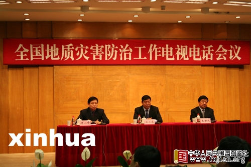 2006年4月19日,全国地质灾害防治工作电视电话会议在北京召开。国土资源部副部长贠小苏(中)在会上讲话。 tujian.org