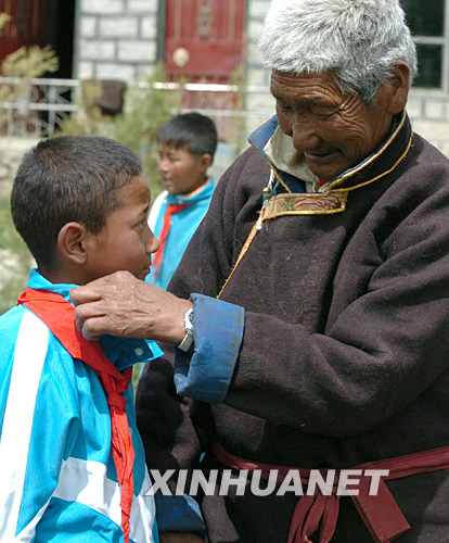 西藏日喀则地区江孜县江热乡班久伦布村格桑顿珠老人和小外孙拉吉在一起(2005年6月12日摄)。格桑顿珠年轻时沦为江孜帕拉庄园的农奴,没有人身自由,也吃不饱肚子。1959年西藏民主改革,特别是1965年西藏自治区成立以来,格桑顿珠翻身解放,当家作主。