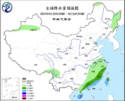 28日08时至29日08时,黑龙江西北部和东部有小雨或雨夹雪,新疆天山地区、吉林东北部、江淮南部、江汉东部、江南中东部、华南中东部、西藏东南部、川西高原南部等地有小到中雨或阵雨,其中,浙江东南沿海、福建东部和南部沿海、广东东南部和西部沿海、海南等地的部分地区有大雨或暴雨,上述部分地区并伴有雷雨大风等强对流天气。新疆北部、内蒙古大部有4~5级风。南海大部海域将有7~10级大风;“凯萨娜”中心经过的附近海域的风力将有11~13级,阵风可达14~15级;台湾海峡、台湾以南海域、北部湾将有6~8级大风。