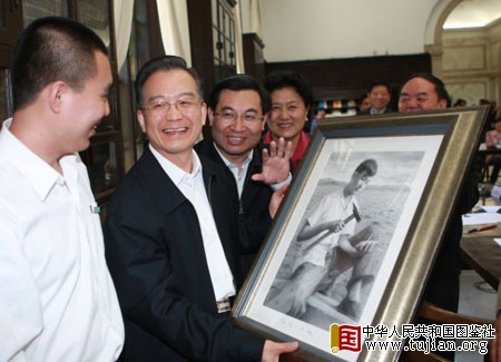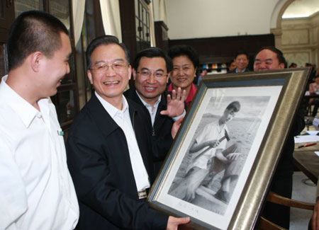 座谈中,来自上海的研究生程莉谈到了自己将作为“选调生”前往四川汶川县工作。温家宝对程莉说:“程莉,你知道,汶川是一个山清水秀的地方,是因为地震的破坏,现在……但是那里仍然是很美的。那里的人民是很善良、很勤劳的。我至今家里头还留着一个羌族的棉背心,那是几十名妇女一针一线给我缝的,非常漂亮!”