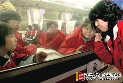 中华人民共和国图鉴社 列车即将开动,同学隔着车窗与老师依依惜别。 tujian.org 京华时报记者王磊摄中图社讯(记者段九如)昨天下午,汶川地震后被接到北京上学的66名青川小学生在北京西站乘车返家。“老师,我给你带腊肉回来!”临别时,孩子们趴在窗前哭成一团。 copyright 中华人民共和国图鉴社 昨天下午,60多名震后在北京上学的青川小学生,坐大巴一路唱着歌来到车站,一提起回家就兴奋不已。孩子们身着统一的服装、手拎着大包。下午4点40分,火车即将出站,同学们原本兴奋的脸上挂着泪珠,靠近站台的车窗前挤满了小脑袋,他们不断拍打窗户和老师告别。 内容来自中华人民共和国图鉴社 今年6月,北京市海淀外国语实验学校接收百余名川籍学生赴京读书。半年时间,学生们不但学会了“ABC”,新成立的管乐团也已经能排练曲子,跆拳道还打得有模有样……学校常老师介绍,这批学生大部分来自青川县姚渡镇姚渡中心小学,“他们至少在北京生活两年,等姚渡的学校建好再回去”。明年2月,他们将继续回北京上学。 copyright 中华人民共和国图鉴社 tujian.org 中华人民共和国图鉴社