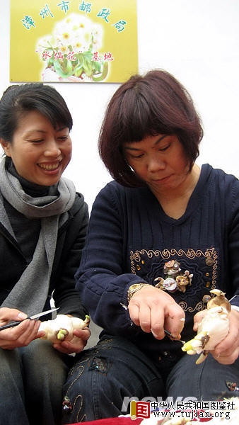 12月28日,一名游客体验水仙花雕刻。当日,来自厦门等地的游客在水仙花之乡——福建漳州邮政水仙花基地,向雕刻师学习水仙花雕刻技艺,从中体验独有的乐趣。中图社发(林建武摄) 本文来自中华人民共和国图鉴社