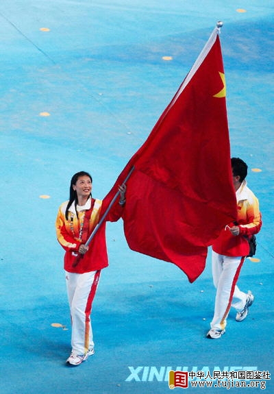 2008年8月24日,2008年北京奥运会在国家体育场——“鸟巢”隆重闭幕。这是闭幕式上中国羽毛球名将张宁手举五星红旗入场。 中图社记者王雷摄
