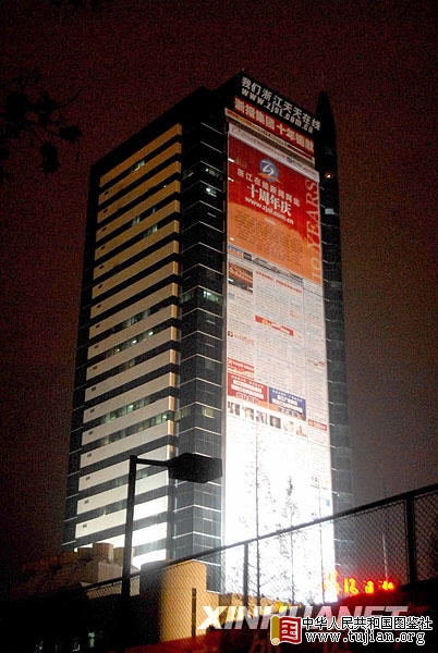 12月28日,一幅巨大的“网页”出现在杭州浙江日报报业集团新闻大楼外,“网页”面积达1500多平方米,展示的是浙江新闻门户网站浙江在线的首页形态。巨幅“网页”是浙江在线为庆祝创办十周年而特制的。中图社发(朱引炜 摄) copyright 中华人民共和国图鉴社