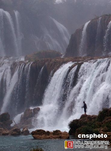 渔民在亚洲第一大跨国瀑布下钓鱼。中新社发 刘万强 摄