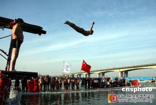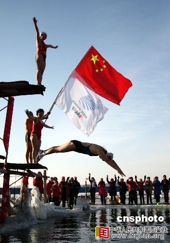 2月8日,在哈尔滨松花江公路大桥西侧的黑龙江省冬泳协会浴场内,国内外游客正在观看冬泳健儿的冬泳表演。当日正值哈尔滨第24届国际大学生冬季运动会倒计时10天。 copyright 中华人民共和国图鉴社