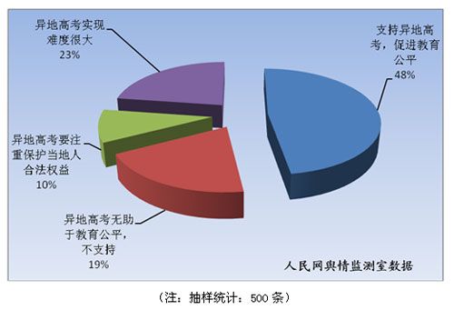 截至3月7日,两会持续到第五天,期间舆论话题层出不穷,而且更迭比较迅速。人民网舆情监测室统计数据显示,今日,排在话题热榜前五位的舆情话题分别是异地[YiDi]高考[GaoKao]、裸官登记、食品安全、放开“二胎”和房产税暂不推广。其中异地[YiDi]高考[GaoKao]跃居今日话题榜之首,成为舆论最为关注的焦点。 3月6日,教育部部长袁贵仁在列席十一届全国人大四次会议时透露,教育部正在研究异地[YiDi]高考[GaoKao]问题,因为涉及的人比较多,所以该问题比较复杂,北京、上海都在研究办法,教育部则主要和接收这些学生比较多的地方逐步共同推进异地[YiDi]高考[GaoKao]。消息一经报道便引起舆论的高度关注。据人民网舆情监测室分析,此方面的网络舆论呈现双面性,一方面高调赞赏教育部的表态,另一方面却又怀疑政府部门的决心,对异地[YiDi]高考[GaoKao]政策的落实持悲观态度。而官方言论亦呈现分化现象,教育部的声音遭遇曲高和寡之势,地方政府的官员言论在肯定政策方向的同时,大多侧重异地[YiDi]高考[GaoKao]实现的困难。 热点话题舆情分析:异地[YiDi]高考[GaoKao] 网络舆论对异地[YiDi]高考[GaoKao]话题的议论焦点主要集中在两个领域,具体如下: 第一,教育不公的根源是什么,异地[YiDi]高考[GaoKao]能否促进教育公平? 关于教育不公根源的问题,绝大多数网友[WangYou]认为户籍制度是导致教育不公的根本原因,异地[YiDi]高考[GaoKao]能够突破户籍制度的桎梏,有效促进教育公平。人民网舆情监测室统计结果显示,有48%的网友[WangYou]认可这一观点,支持实现异地[YiDi]高考[GaoKao]。 但是,也有舆论认为教育资源的分配不均和招生制度的不合理才是教育不公的根源,异地[YiDi]高考[GaoKao]无助于实现教育公平,反而会带来很多新的问题,譬如大城市人口恶性膨胀,催生新的限制标准,当地人的教育权益被削弱等。人民网舆情监测室统计结果显示,19%的网友[WangYou]认为异地[YiDi]高考[GaoKao]无助于教育公平。要想真正实现教育公平就必须在全国范围内均衡的分配教育资源,改革现有的招生制度。 第二,何时能够实现异地[YiDi]高考[GaoKao]?实现难度如何? 关于异地[YiDi]高考[GaoKao]政策落实的问题,尽管绝大多数网友[WangYou]力挺异地[YiDi]高考[GaoKao]政策,但是对其落地前景却持悲观态度。人民网舆情监测室统计结果显示,认为异地[YiDi]高考[GaoKao]政策能够很快落实的网友[WangYou]寥寥无几,另有23%的网友[WangYou]认为异地[YiDi]高考[GaoKao]实现难度很大,牵扯到方方面面的利益和事情,绝非教育部门能单独解决的问题,所以近期不会有大的突破。 支持地高考[GaoKao],促进教育公平(48%) 网友[WangYou]“心静似水”:看到这篇新闻太振奋人心了。一直以来孩子读书、高考[GaoKao]是我们这些长年在外务工的打工仔心头的痛。感谢教育部长说出了千千万万个家庭实际问题。希望能早日实现。 网友[WangYou]“szlbq666”:我们希望这个制度早点出台,标准可以高一些,这样我们才会有些许的公平可言。 网友[WangYou]“毓洁花园”:异地[YiDi]高考[GaoKao]真的很必要!终于有人开始关注流动人口子女的前途了,对他们来说取消户籍制度,允许他们参加异地[YiDi]高考[GaoKao],真的能改变他们的命运啊。 网友[WangYou]“孙云晓”:解决流动人口子女在流入地高考[GaoKao]问题才是以人为本。 网友[WangYou]“竹子”:双手双脚赞成,真能异地[YiDi]中考高考[GaoKao],就能解决许多社会问题。 网友[WangYou]“沧海一游”:广大的外来工为当地的经济建设做出了巨大的贡献,他们的子弟的高考[GaoKao]问题,应该引起全社会的关注,孩子们是没有错的,不能歧视他们,这才是真正的和谐社会! 异地[YiDi]高考[GaoKao]无助于教育公平,不支持(19%): 网友[WangYou]“yypz”:教育不公平问题的关键不在于是否允许异地[YiDi]高考[GaoKao],而在于录取人数上的不均衡和录取分数线上的不公平。比如说高考[GaoKao]450多分在北京就可以读重点,在湖南就只能读专科,这怎能不让人都想往大城市挤?而且,在我看来北京的考题并不比外地难,为什么录取线有这么大有差别?这很让人深思。 网友[WangYou]“花鼓”:教育资源不平衡是异地[YiDi]高考[GaoKao]的主要动因,实行“全国统一价”,规避教育地区歧视,还学子一个公平,一切皆可解决。 网友[WangYou]“SeraphBX”:在哪里考试不是问题,问题是农民工子女应该以本地卷还是以全国卷参考。志愿是以户口归属地填报,还是以流入地填报。前后期的行政程序才是问题所在。 网友[WangYou]“iamsy”:在公平、公正、公开的方法没有得到执行的前提下,实行异地[YiDi]高考[GaoKao],是一个劳民伤财的下策。如果是就业问题,那么也是采取异地[YiDi]招聘就业吗? 网友[WangYou]“屹立不倒的布尔什维克”:北京上海如果建设异地[YiDi]高考[GaoKao]制度,势必造成生源素质下降,生源过多等等乱象。 异地[YiDi]高考[GaoKao]要注重保护当地人合法权益(10%): 网友[WangYou]“BUZUOHUTUREN”:教育部总是与中央和北京市调控人口政策唱反调,这么一来北京的人口不爆炸了吗?你们就不会想点别的办法?比如全国统一教材,统一录取分数,统一试卷? 网友[WangYou]“Ciel-弥”:京沪实行异地[YiDi]高考[GaoKao]能行吗?从教育部门看,考生在当地参加高考[GaoKao],技术上没问题。但当地的利益就不是教育部能管得了的了,要把各种因素进行仔细分析,因为现在的情况不像以前那么单一。 网友[WangYou]“潇洒”:也要注意高考[GaoKa