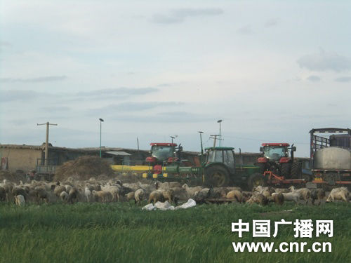 缓冲区内的大型机械和羊群(中广之声记者[JiZhe] 陈俊杰/摄)