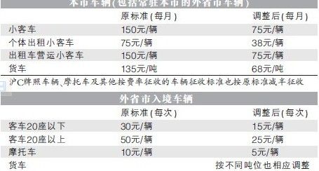 东方网4月28日消息:据《东方早报》报道,自5月10日起,上海市将对贷款[DaiKuan]道路[DaoLu]建设车辆通行[TongXing]费征收标准进行调整。其中,出租营运小客车和普通小客车的征收标准都将从现在的每月150元/辆减少到75元/辆,也就是说,一般私家车每年需要缴纳的通行[TongXing]费都将从1800元减少到900元。
