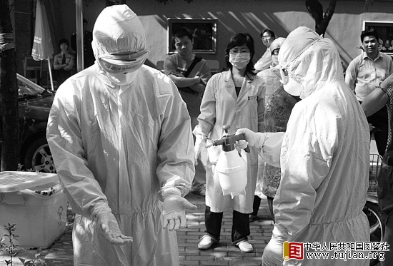杭州江干区某甲型流感隔离区,卫生防疫人员每做完一件事,就要为自己消毒。魏志阳 摄