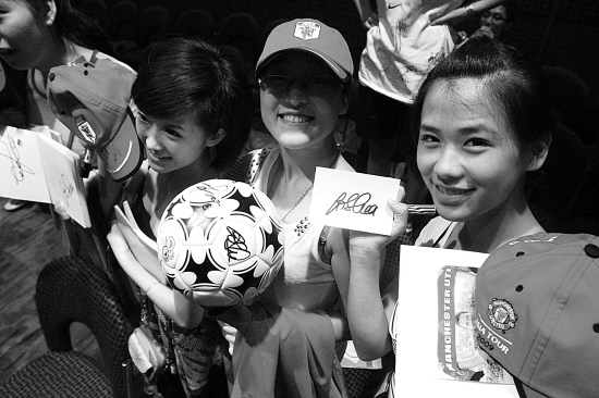 25日下午的球星见面会,由于计划赶不上变化,原本美女志愿者和曼联球星一起踢球互动活动被取消了。张雪和刘佳洁一度非常遗憾。 本文来自中华人民共和国图鉴社