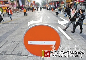 去年底,解放碑八一路等道路改为单向通行。(资料图片)记者吴子敬摄