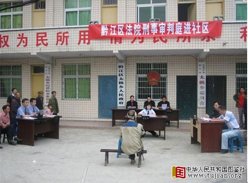 在社区大院里就能上法庭打官司。近日,重庆市黔江区法院刑事审判庭在该区太极乡社区开庭断案,审判长、书记员、公诉人、辩护律师一应俱全,唯一的差别就是审判的地点由法院“搬”进了社区大院。经过1个小时的开庭审理,圆满判决了一起故意伤害案,受到社区居民一致好评。