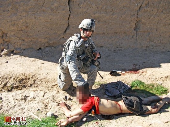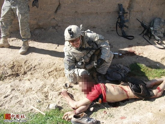 2010年1月15日,一名美军“杀人小组”成员在阿富汗[AFuHan]一名叫古尔-穆丁的农民的尸体旁摆姿势拍照