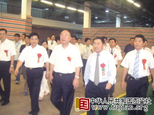 图为重庆市委常委、常务副市长黄奇帆(右三),上海华谊集团党委副书记、总裁刘训峰(右二)在轮胎下线仪式现场。 (商乾 摄)